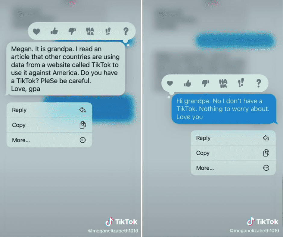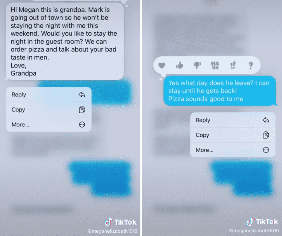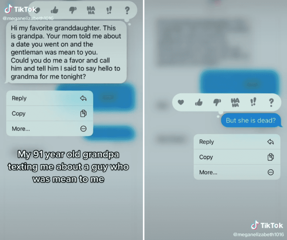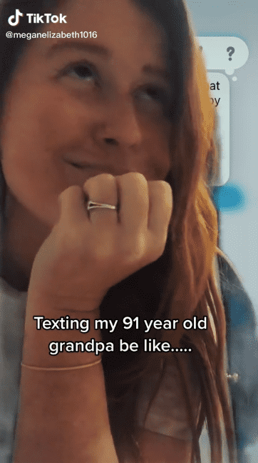 Megan Elizabeth decided to share her grandpa's messages of concern with the internet. "Texting my 91-year-old grandpa be like..." she wrote and shared screenshots of their exchanges in a now-deleted video. In one message he tells her, "This is grandpa. I read an article that said if you do not find a life partner by 29, you most likely die alone. Your birthday is coming up in 3 months. Just wanted to let you know." At least he remembered her birthday. In another message full of concern he said: "Megan, this is grandpa. I hope you are keeping the weight you lost off. Remember, heart disease runs in our family."