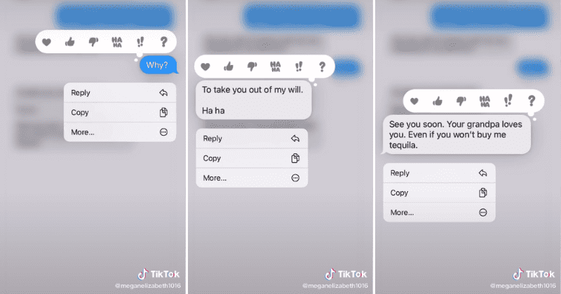 He always signed off the messages with "Love, Grandpa" and in case she forgot, always started the message by letting her know it was grandpa. Some habits are hard to shake off. "Hi Megan, this is your grandpa," he wrote again and continued, "I hope you aren't drinking a lot. I saw on the news that alcohol sales are sky-high because millennials are depressed. Love you always, grandpa." The messages are so blunt and straightforward with concern that it's absolutely heartwarming. Megan's response to her grandpa's concerns was also apt, as she thanked him for the information and assured him she was fine. There was also this gem: