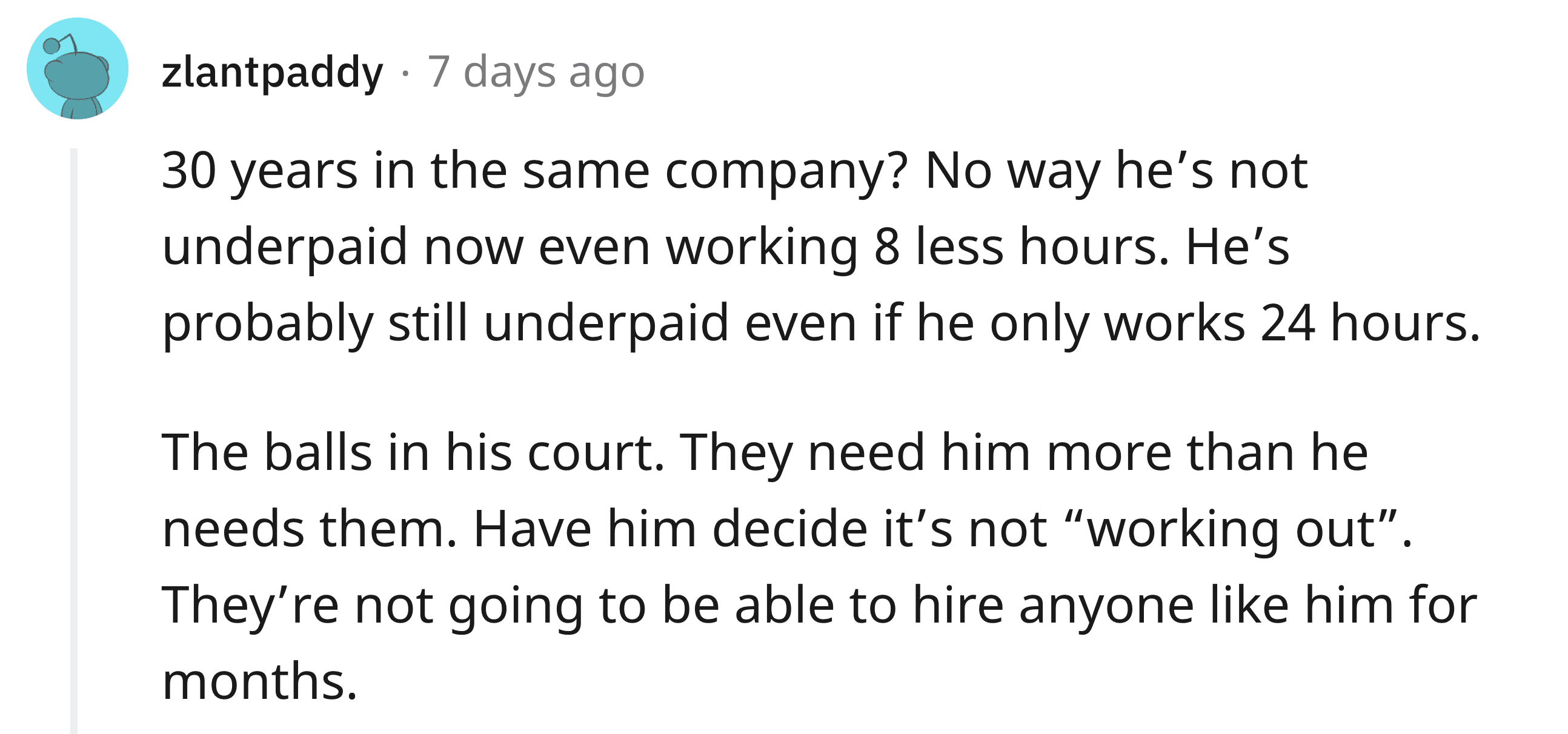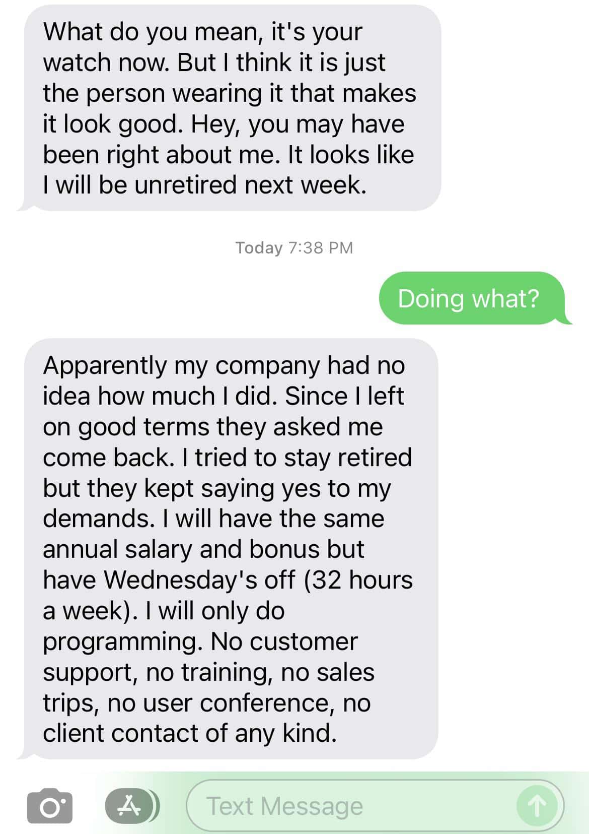 "Apparently my company had no idea how much I did. Since I left on good terms, they asked me to come back," he continued. The senior went on to explain that although he "tried to stay retired," every time he made a new demand, the company simply agreed immediately—that's how bad they wanted him back. "I tried to stay retired, but they kept saying yes to my demands. I will have the same annual salary and bonus but have Wednesdays off (32 hours a week)," he proudly shared.