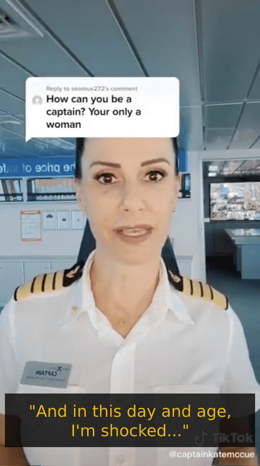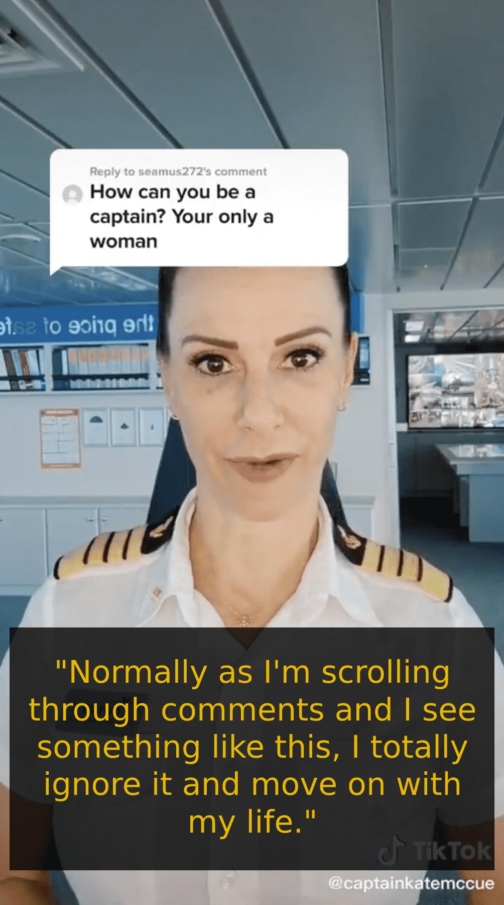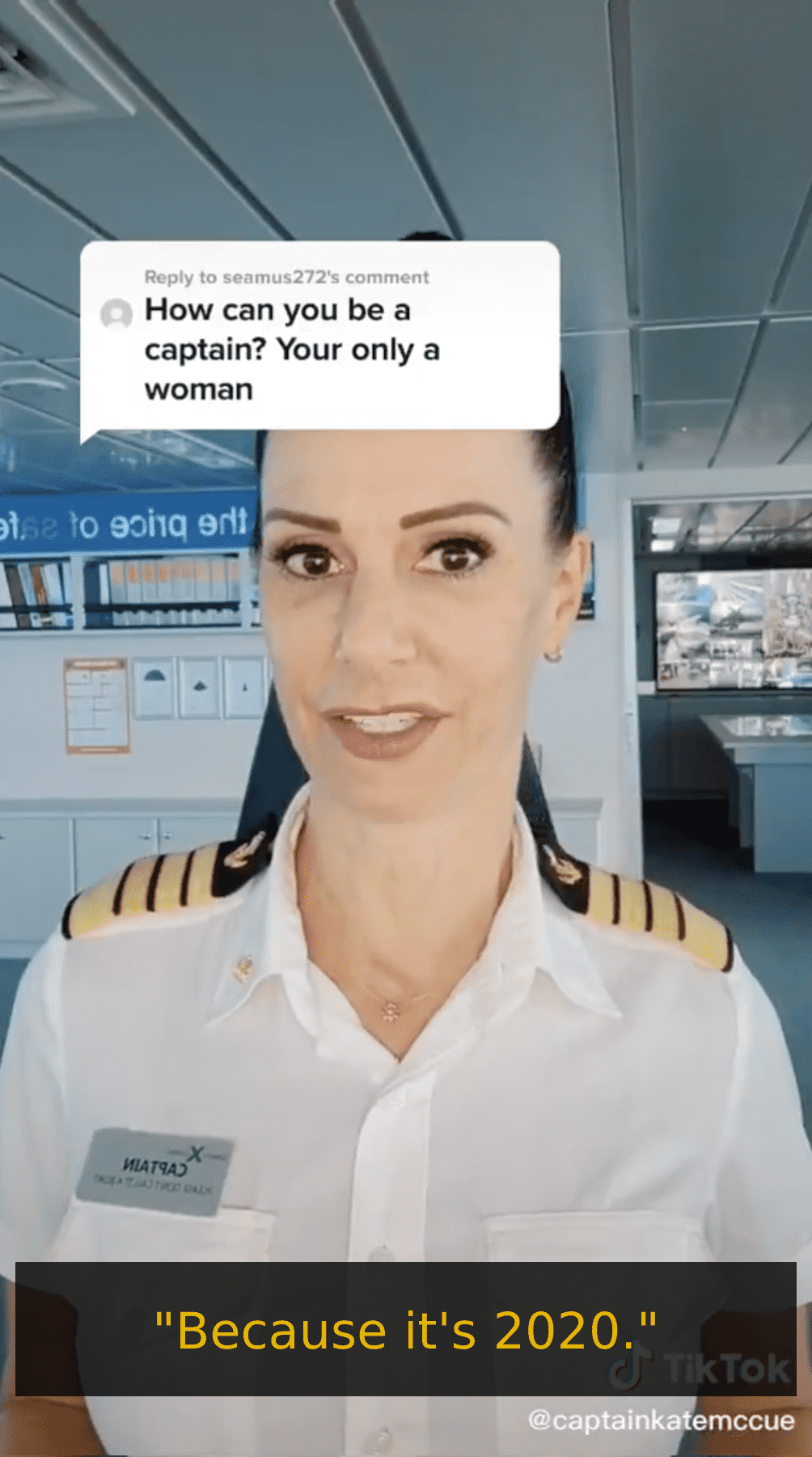 That is, until she came across one particularly sexist comment that read: "How can you be a captain? You're only a woman." Rather than ignore it like usual, something about the comment urged Capt. McCue to respond to it with an epic comeback on TikTok.