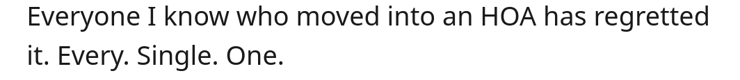Many others shared their own problematic stories of HOAs interfering in people's lives for no valid reason. As in the case of this parent, many were simply abusing the HOA rules to annoy and make life harder for those living there. "Now, they will report them for not getting a permit to place that note on the tree," joked one person. One person called on the parent to fight back by getting elected to the HOA. "Dave, Fight back. Don’t let them win. Take over the HOA and change the rules. Work from inside the system if you must. Don’t let the children down. I really really need to know you didn’t let this idiot have her way. Let me know if you need help. Dave’s of the world UNITE!" they wrote. Another person recollected his own experience of his HOA interfering for no reason. "I remember when I was 13 and just moved into a new house, finally got my own room after sharing a room with my brother for as long as I can remember. I was so excited to decorate my room. I hung pictures of things I drew on my window. The next day, my parents got a note and fined. We were told to take those pictures down because "they make the houses look cheap." I was sad and have hated HOAs ever since."