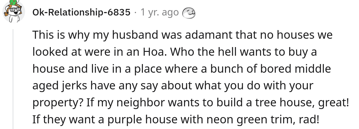 HOAs can be very petty as one Reddit user pointed out. "In my wife's old neighborhood, people would ride horses around since the streets are basically 4 car lanes wide with houses that had at least 2 acres of land. There were tiny yellow signs of people riding horses on some of the stop signs. Someone would install signs with unicorns every now and then but the HOA would immediately take them down as the HOA did not approve those signs because there were no unicorns," noted one person. Another person opined, "It is interesting that American society is so shallow that a treehouse or unapproved color or non-standard decoration can get you in hot water, but your neighbor being a homophobic, misogynistic, adulterer, and all-around a$$hole is no big deal," added one person.