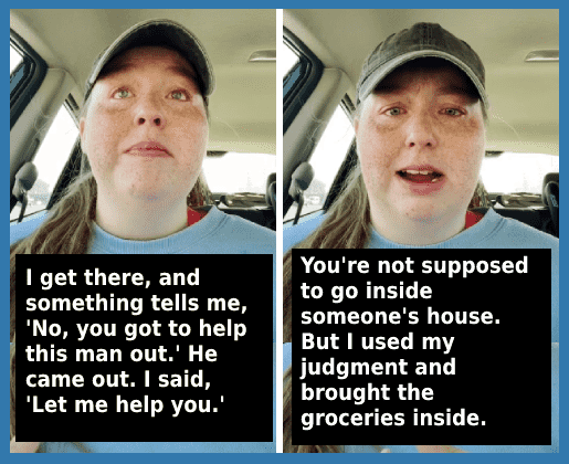 "He came out. And I was like, 'Okay, well, let me help you.' I got the groceries and you're not supposed to go inside someone's house. But I used my judgment. And I brought the groceries inside. Put them down wherever he wanted me to put that. You're not supposed to but I did. And you're just supposed to take a picture and leave. And I could not just leave," she wrote.