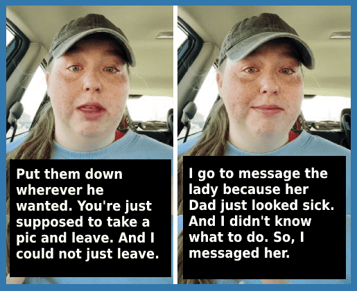 After smelling gas in the house, she decided to drop a message for the woman before the order was completed. "I go to message the lady because I was very concerned for her dad that he just looked sick. And I didn't know what to do. So, I messaged her and I said, 'If I say that the order is complete. I won't be able to message you and I want to tell you this. And I said, 'It's very unprofessional of me to say something.' I wasn't going to I never talk I always just put the groceries down and leave. This time, for whatever in my head, I was like 'You gotta say something. You gotta say something, Jess.'" she recalled thinking.