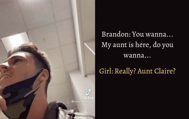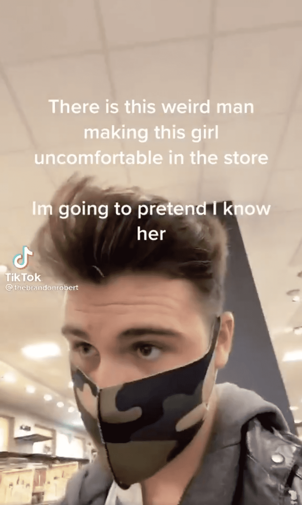 "There is this weird man making this girl uncomfortable in the store," Brandon explains at the beginning of the video. "I am going to pretend I know her." He then approaches the girl while lowering his mask to show her his face and acts as though he has met her before, saying: "Oh my god, hi!" The girl immediately catches on and plays along with his bit, asking Brandon how he is. When Brandon asks her who the man beside her is, she makes an incoherent sound to indicate that she doesn't know him.