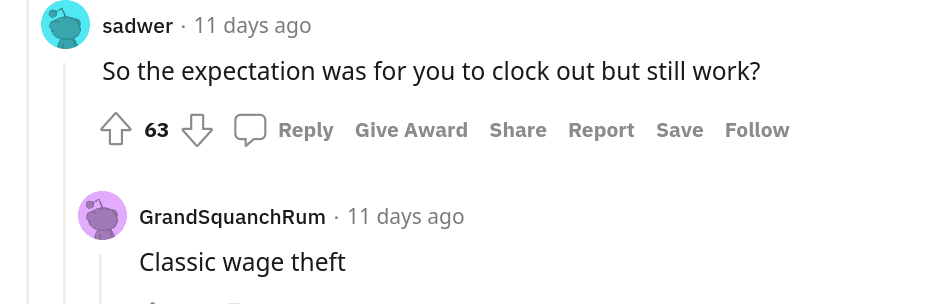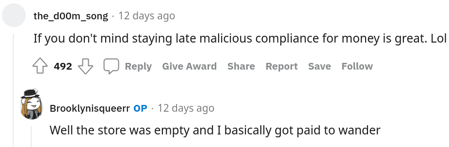 She decided to follow her manager's words to a tee, and thus pocket a little extra money. "I continued to wander the store and slightly fix shelves, making sure I was near my manager. After about 2 and a half hours she said 'you’re still here, why haven’t you gone home?' I replied 'you said I need to wait to be told to go home.' My manager looked at me as though she was mentally kicking herself 'just go,' she said. I clocked out and that’s how I got paid an extra $30 for doing literally nothing." When some people asked if she didn't value her own time, she replied, "Nah, this company is very stingy with hours for everyone and the way I see it I got paid while barely helping the company, so I don’t care."