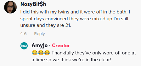 Numerous users praised the life hack's ingenuity, sharing their own tips and experiences in the comments. "Yup. Pierced my girls' ears at 6 weeks with different earrings because I couldn’t see their tiny toes in the dark," confessed one person. "Good idea!" responded Amy Jo. "These guys basically have everything in their colors, including sleep sacks and all, so we can usually always tell." Another commented, "Awwww, I love this. I’m a triplet, and my mom marked our feet A, B, and C with a permanent marker." One user wrote, "I am a triplet and was never color-coded. I know I must have been switched a few times."