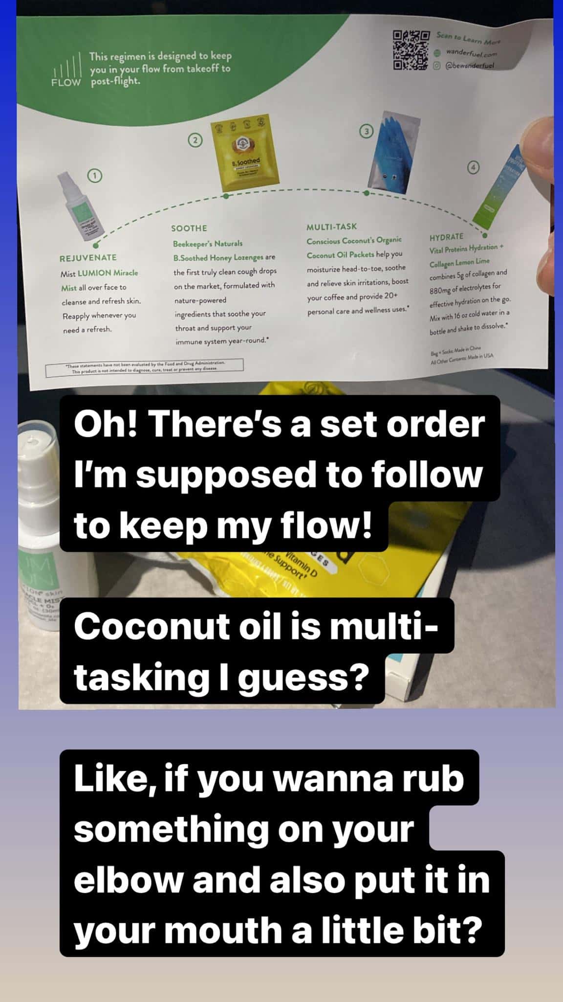 Among other cool features, such as a special pocket for "loose jewels" or a "Rolex pouch" and a reading light bright enough for surgery, Everythingiscomingupmilhouse hauled the free swag bag they received as part of the flight. The bag comprised most notably a sachet of coconut oil as well as other cool products, including extra socks, a "miracle mist," lozenges, and a protein dietary supplement. At the end of the journey, they took stock of everything they learned. For instance, they reaffirmed that they would remember how flights could definitely spare a cookie while first-class passengers munched on steak and did "God knows what with coconut oil." They also encouraged folks to send positive feedback about hardworking flight attendants to plane carriers via email or direct messages on social media. They concluded, "Even if there's no monetary award attached, I'm sure the anonymous positivity can only help." (PS: As the user pointed out, there is still turbulence in first class, unfortunately).