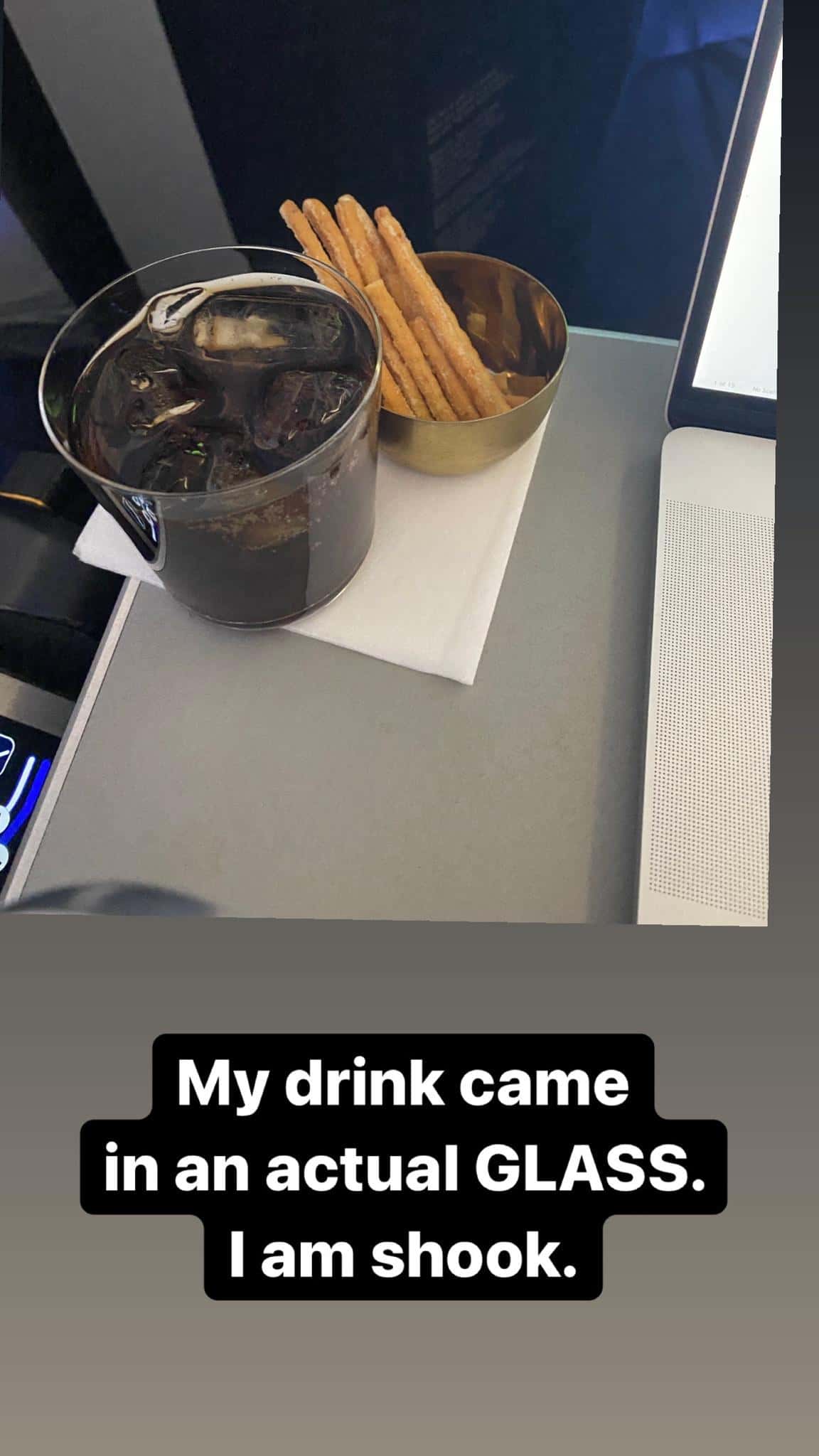 The user's thread started with their complimentary drink, which arrived in an "actual glass," as they noted. (In coach, it is not uncommon to receive your drink in a plastic or paper cup.) The user also received some breadsticks. Then, they shared a prior experience they underwent. "Seriously though, a few days ago when we were flying coach, they yelled at a woman for asking for two cookies, and I got trapped in the bathroom for an hour when the door jammed," they wrote. "Now I'm eating little gourmet bread things out of a dish and drinking out of a real glass. Life be funny."