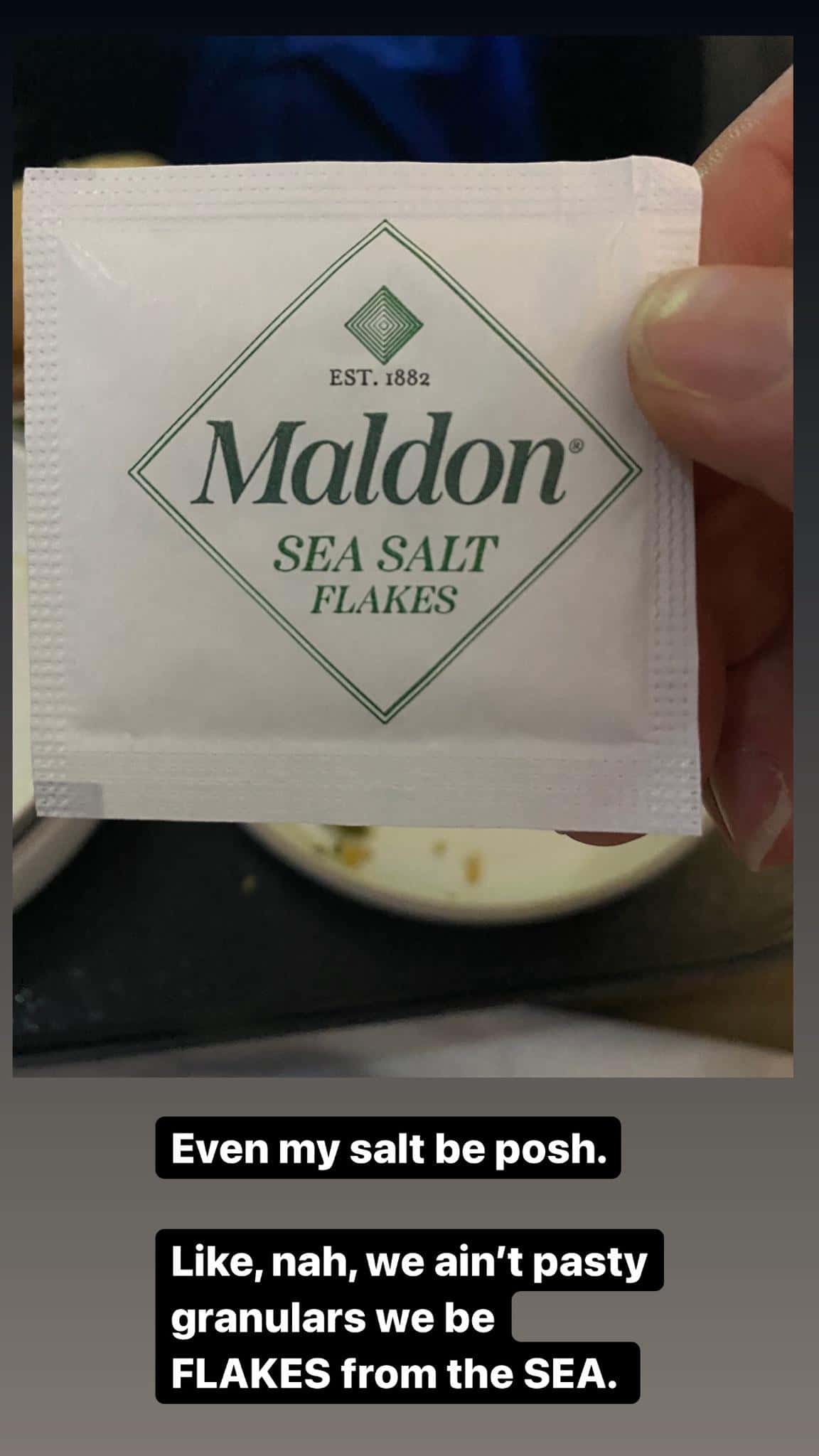 Additionally, they shared a conversation they overheard. "Guy next to me mad 'cause his cold salad's cold..." They stated. "Man... Fancy stuff be wasted on rich people. Give it to us poors! We'll be delighted by two cookies." Showing us their "Maldon sea salt flakes," they added, "Even my salt be posh. Like, nah, we ain't pasty granular, we be FLAKES from the SEA." They also snapped a photo of their dessert (which would be delicious even on-ground). "I'll bet they'd even give me two cookies if I asked," they noted. "But that might out me as a secret poor. Must maintain a veil of wealth and resist cookies."