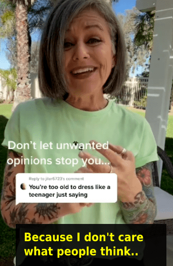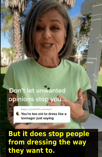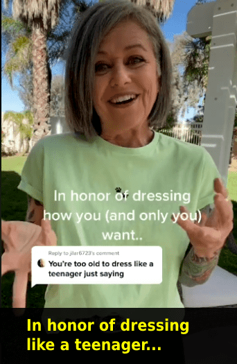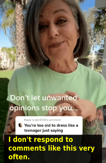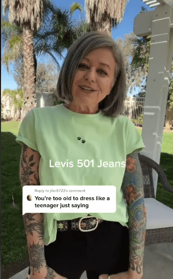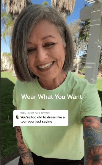 When someone told social media influencer Lonni Pike how to dress, she wasn't having it. Pike, who runs the blog "Gray Hair And Tattoos," is more than 50 years old living life in style. The woman, as her blog suggests, has gorgeous gray hair and is covered in tattoos. Pike is “loving life over 50 and owning her style.” One look at any of her social media platforms and you know she's impossible to box or categorize. Pike runs a TikTok account where she dresses up in cool outfits and has more than 564,000 followers on the platform. Someone made a rude comment on one of her videos, telling her “you’re too old to dress like a teenager.” Pike responded the only way she could, by owning the comment. She released a whole video about "dressing like a teenager." She wore cute little jeans and a tucked-in T-shirt along with a Dr. Martens.