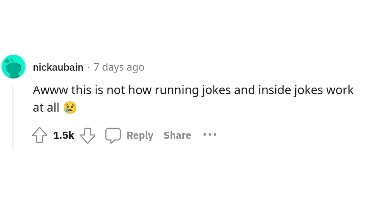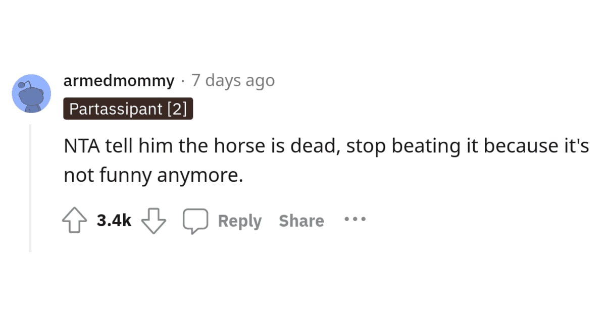 While many Redditors found the post amusing, most sympathized with her and agreed that he’d taken it too far. Some even speculated that the joke might be a passive-aggressive way to cause a breakup. "Definitely something else going on here. Reminds me of that post where the OP's husband spent almost an entire year constantly using baby talk with her in order to win a baseball and then doubled down when she finally found out what was going on, and then she divorced him over it," wrote one person. "I was annoyed with you for the sheer number of times you repeated that phrase in your post. I couldn’t imagine having to constantly hear it," one Reddit user commented.