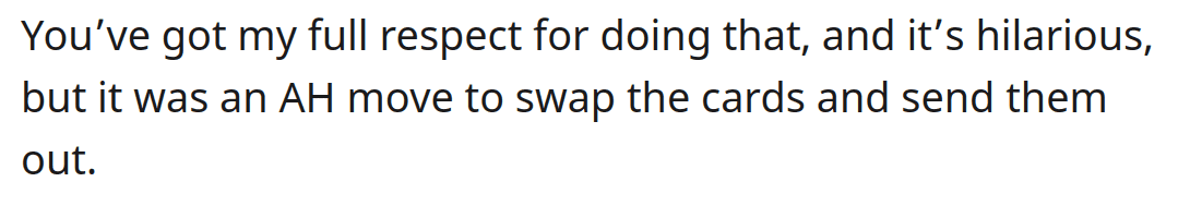 "We took a bunch of pictures, with props and picked a favorite of us all standing in silly action poses wearing raccoon skin hats. Between the makeup, hair, and big hats, we all agreed my friends looked like my parents when the picture was postcard-sized. It was honestly a really fun photo, really different than the serious ones my family always takes. I had it printed on cards and signed them with "Love, The (Name) Family." I swapped the cards in the envelopes my mom had prepared and resealed them with the sort of stickers she uses," she wrote. Some of the family members who received them thought it was a joke. "A few people mentioned to my mom that the picture was "funny," which pissed her off because she thought they were talking about her very boring photo of them all sitting on a picnic blanket with a giant Easter basket," she wrote. "Then my aunt sent a photo of the card to the family group chat and said, "this isn't you, is it?" And the gig was up... My mom was furious at me for sending out the joke cards and embarrassing the family and also for not sending the cards she had made and wrote in," she added.